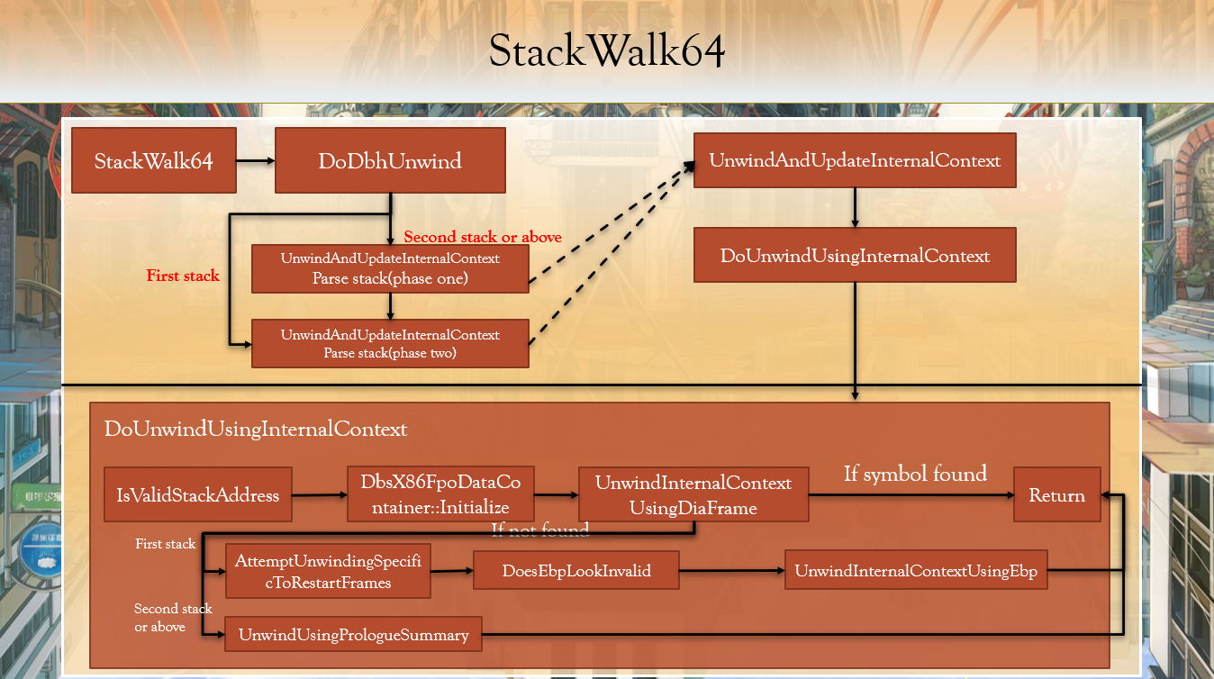 DoDbhUnwind 为栈回溯的真正起点,由 StackWalk64 到 DoDbhUnwind 的过程都可理解为包装。
