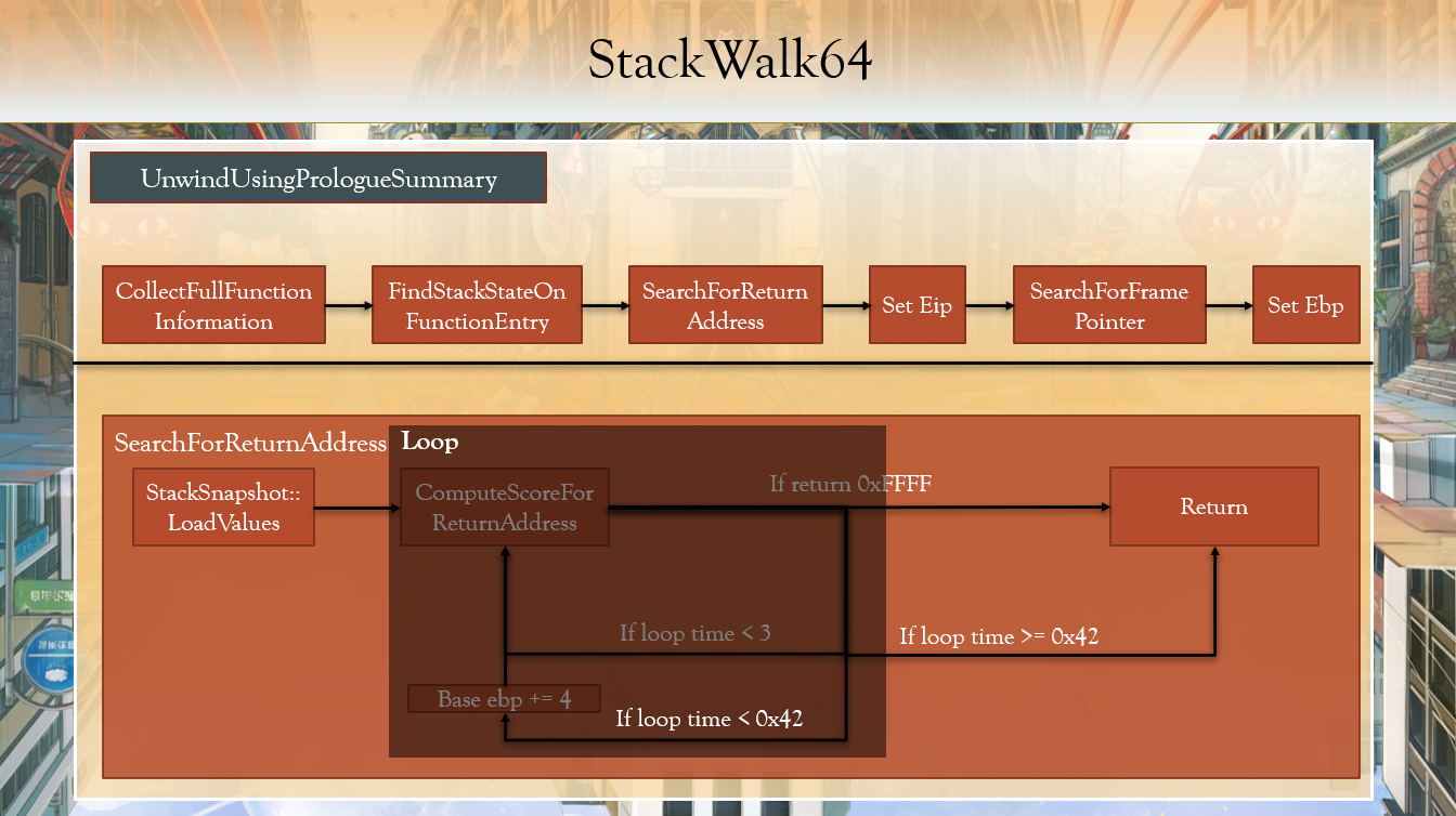 回顾 4.2 节的第二层栈回溯流程图,该函数先调用 CollectFullFunctionInformation 和 FindStackStateOnFunctionEntry 获取一些函数状态信息,之后调用 SearchForReturnAddress,通过 windows 自定义的算法去寻找真正符合要求的返回地址。之后再调用 SearchForFramePointer 寻找 framePointer (帧指针),不过这个过程往往是直接从 ebp 读取出新的 ebp。