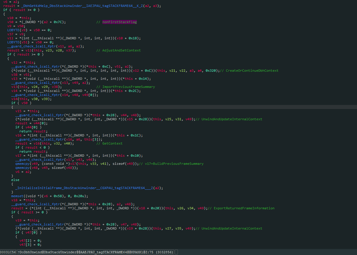 找到 ebp 和 eip 之后,将其保存到 DbhStackServices 类的 0x388 和 0x38C 偏移处。到这里,UnwindAndUpdateInternalContext 就结束返回了,最后将 DbhStackServices 类获取到的 eip 交给 STACKFRAME64 结构体(StackWalk64 提供的参数)。