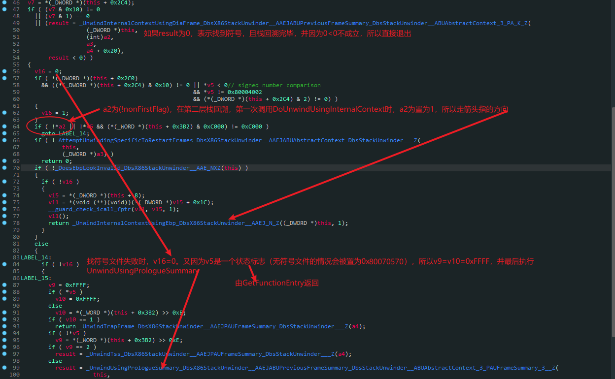 在栈回溯时,有符号与无符号的执行流程是有差别的。有符号的情况下,UnwindInternalContextUsingDiaFrame (win10 下) 会读取符号,解析符号,直接返回。如果要分析有符号的情况,各位重点查看这个函数即可(winXP 下是 DbsX86StackUnwinder::ApplyUnwindInfo)。