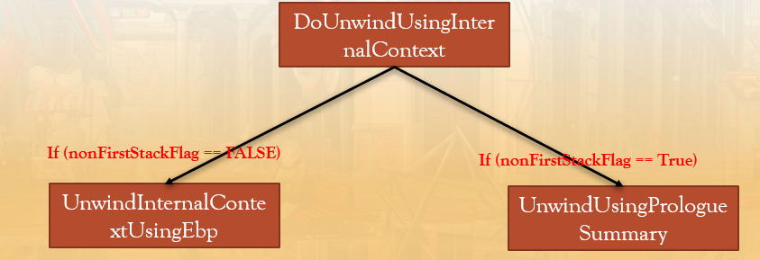 根据 4.1 节和 4.2 节的描述,我们知道第一层栈回溯是通过 UnwindInternalContextUsingEbp 实现的,第二层或之后的栈回溯是通过 UnwindUsingPrologueSummary 实现的,选择执行哪条分支是通过 nonFirstStackFlag 来判断的,如下图: